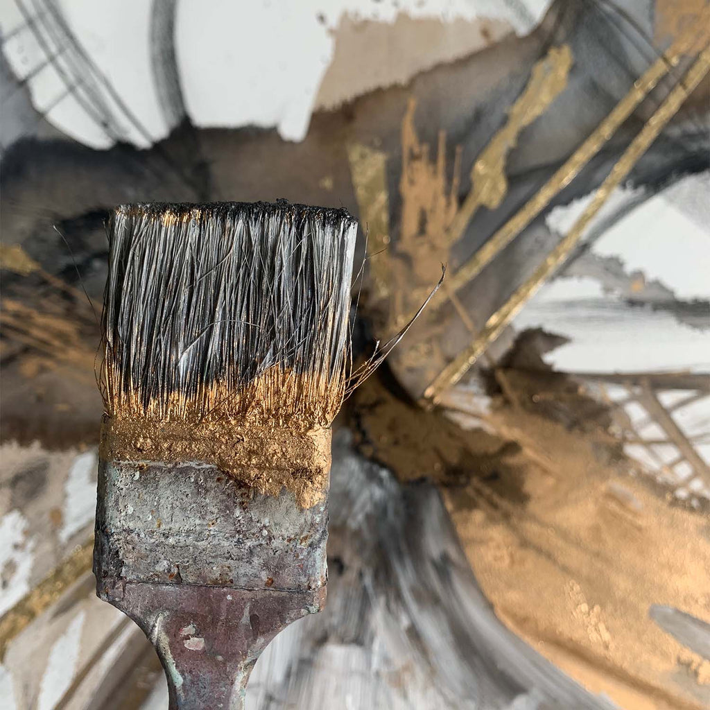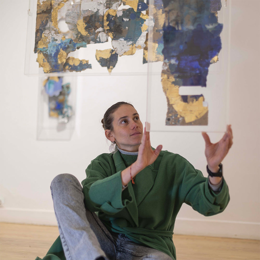 Kahn seeks to capture the movement and the connection between spaces she’s inhabited through the use of mixed mediums including painting, collage, sculpture, recycled cardboard, pigment and ink. In doing so she creates pieces that evoke a deep sense of respect for the earth and it’s geographic features. Abstract forms capture the temperamental nature of water, the angularity of stone, and the softness of air. Kahn highlights the mineral richness of Latin America through the use of gold and silver leaf; a testament to the artistic tradition of the region from a historic perspective.