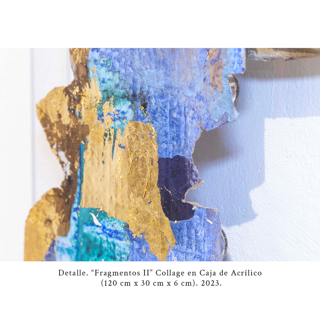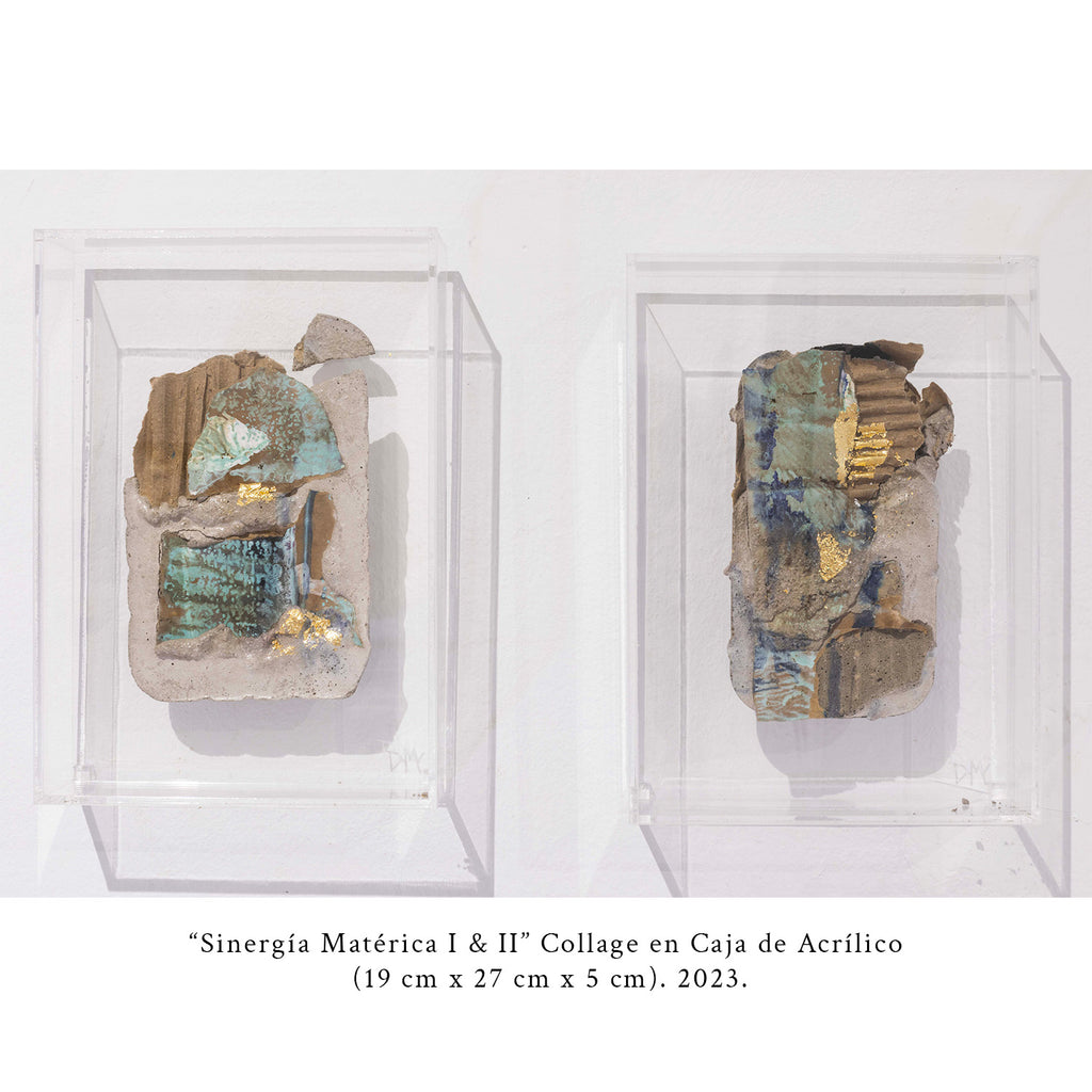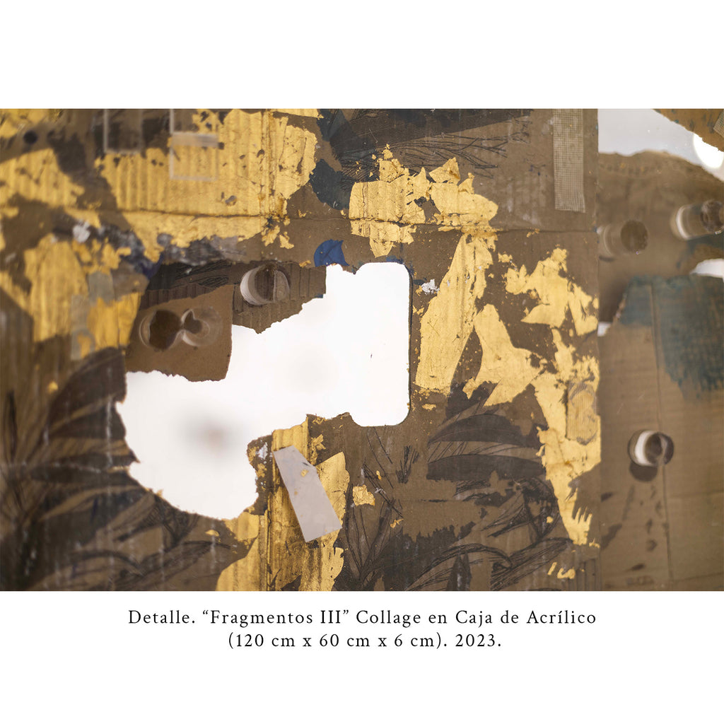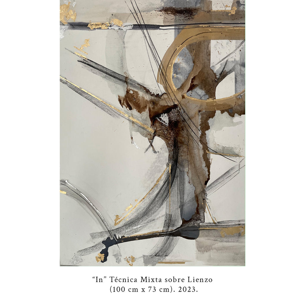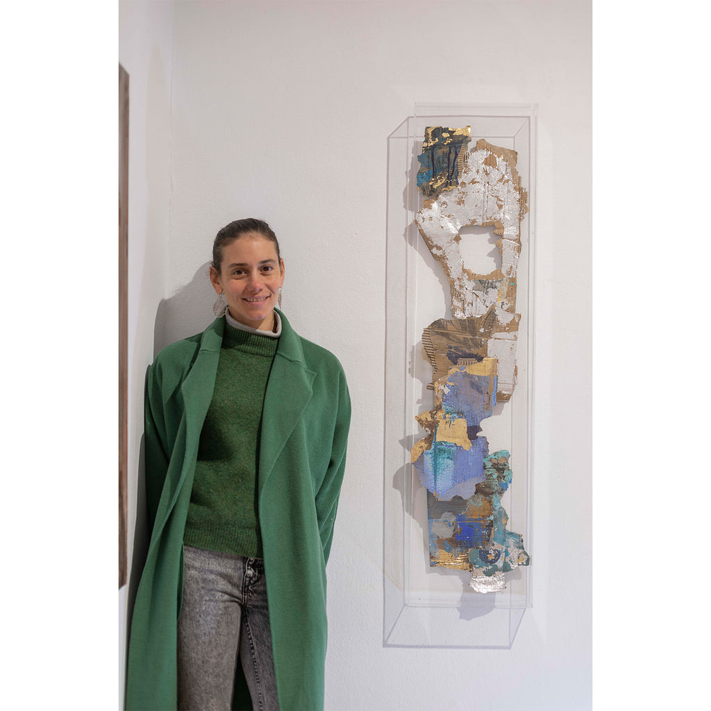 Through mixed media techniques, Kahn invites us to delve into a captivating play of textures and forms, where a diverse range of materials, such as pure pigment paint, cardboard, cement, walnut stain, imitation gold leaf, and Chinese ink, among others, converge to breathe life into spaces that evoke her Dominican roots, German, French, and Argentine heritage, as well as her Ibero-American present, in a continuous dance between lima and Madrid.