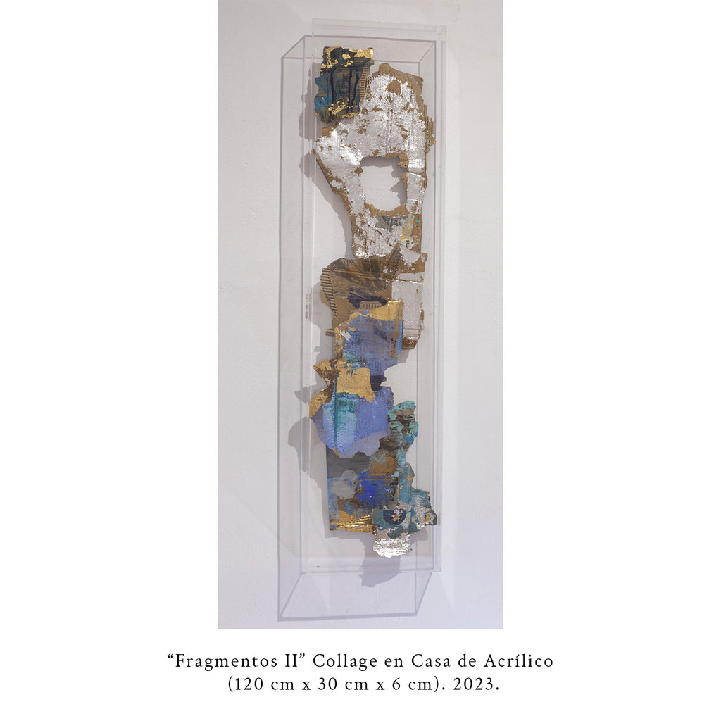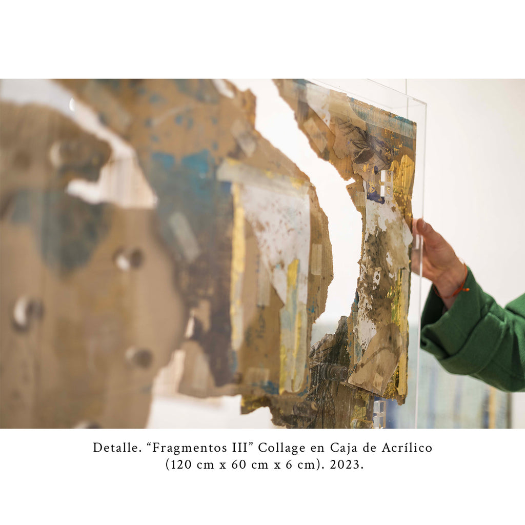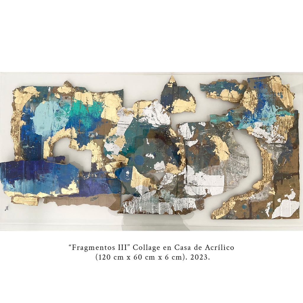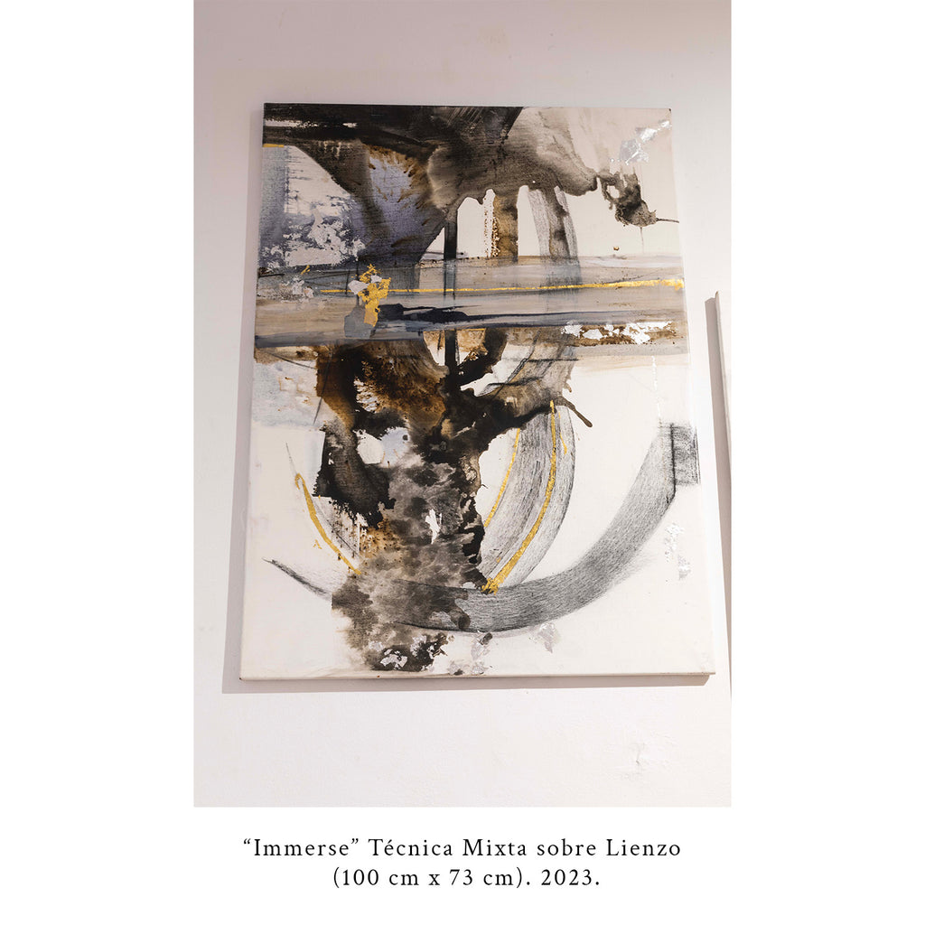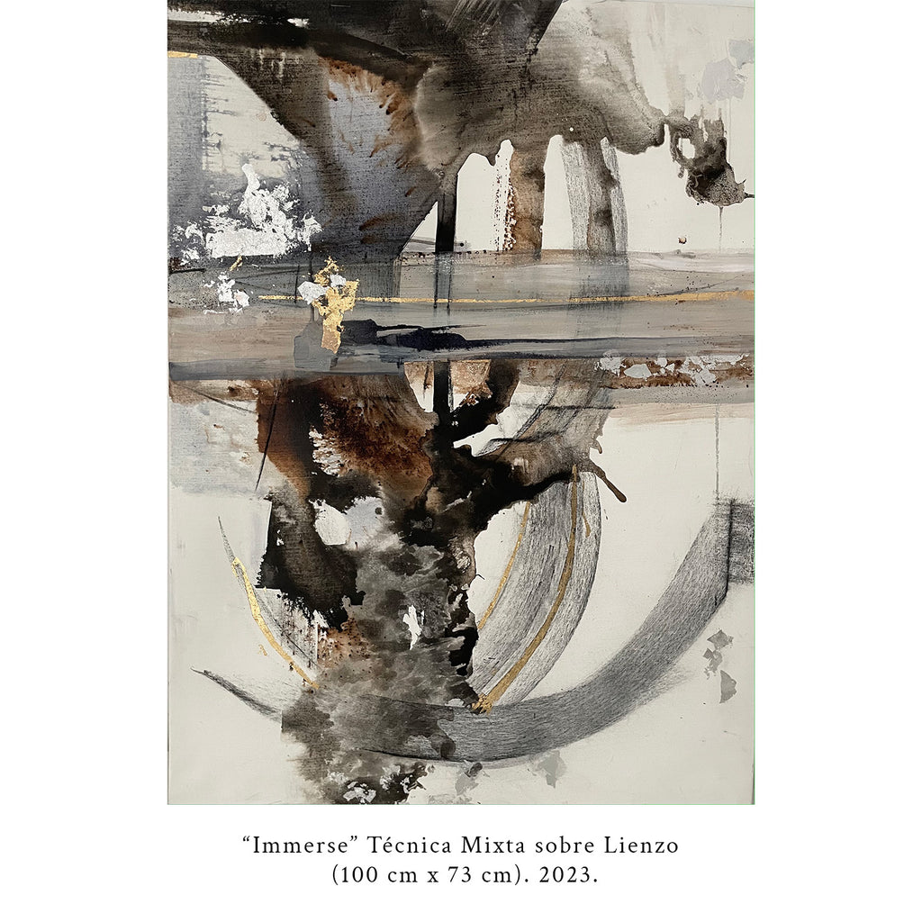 Through mixed media techniques, Kahn invites us to delve into a captivating play of textures and forms, where a diverse range of materials, such as pure pigment paint, cardboard, cement, walnut stain, imitation gold leaf, and Chinese ink, among others, converge to breathe life into spaces that evoke her Dominican roots, German, French, and Argentine heritage, as well as her Ibero-American present, in a continuous dance between lima and Madrid.
