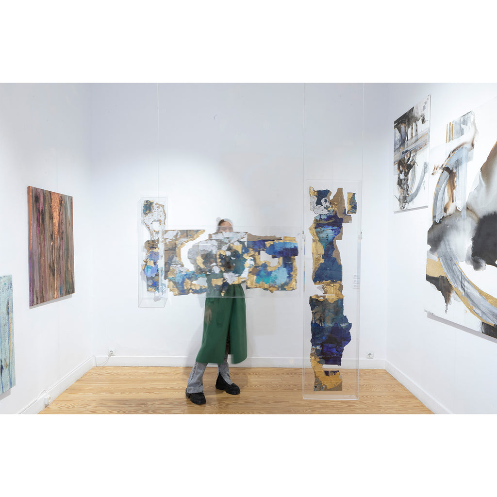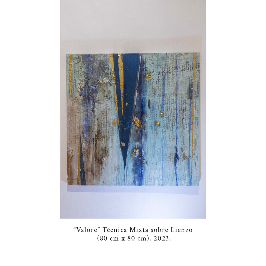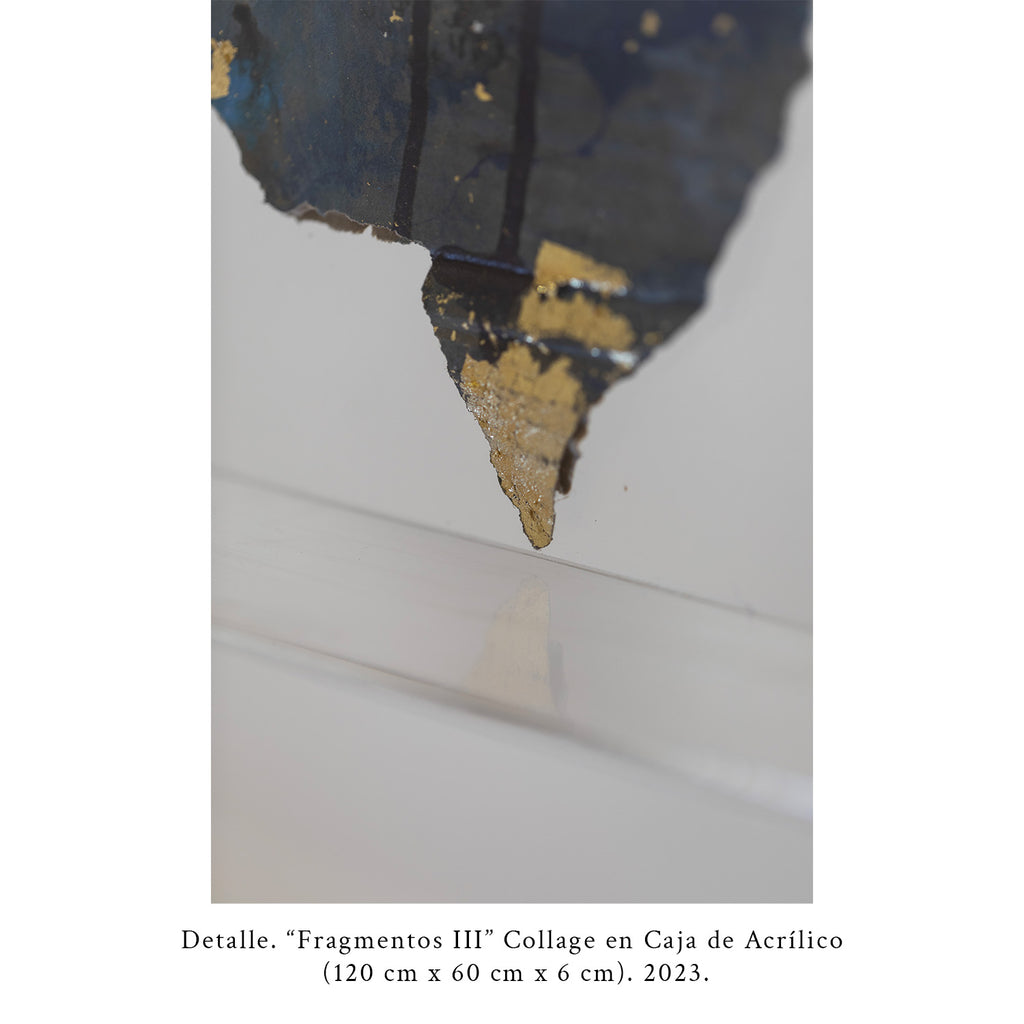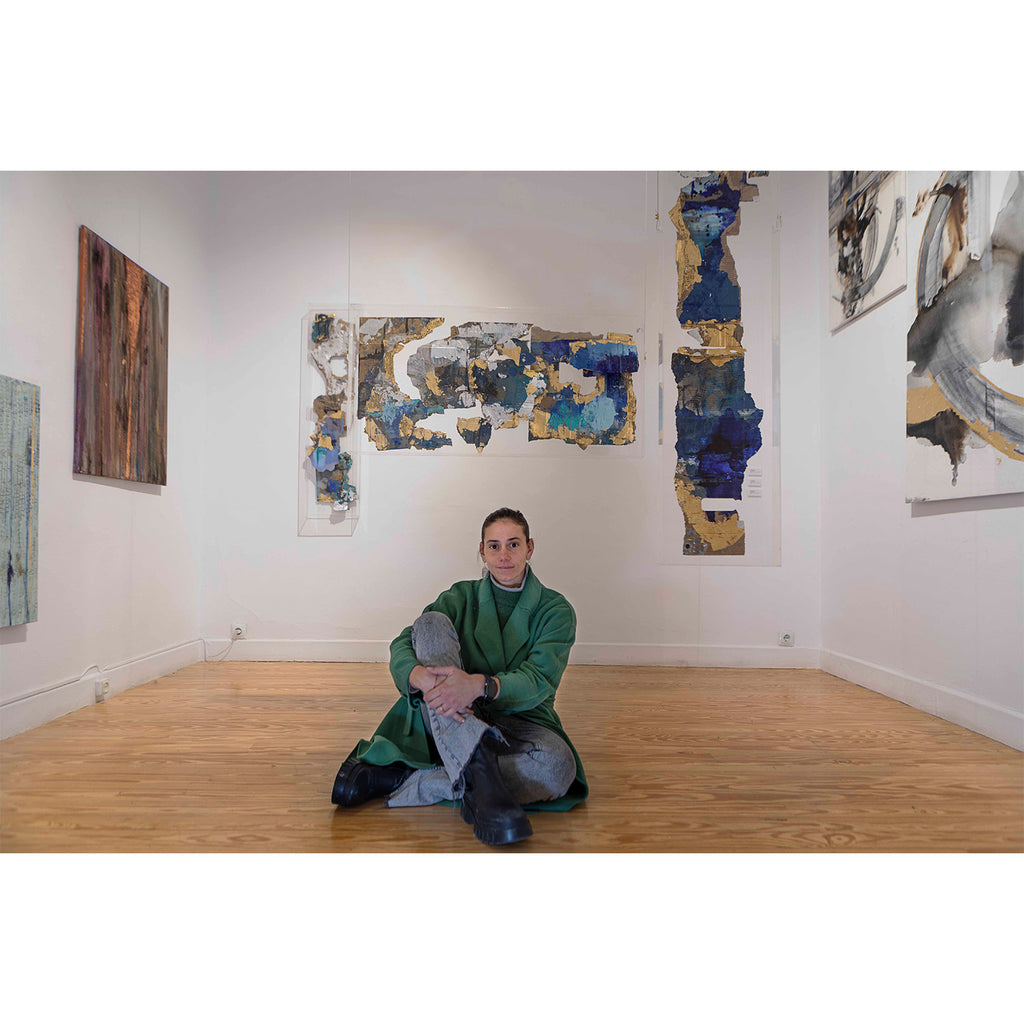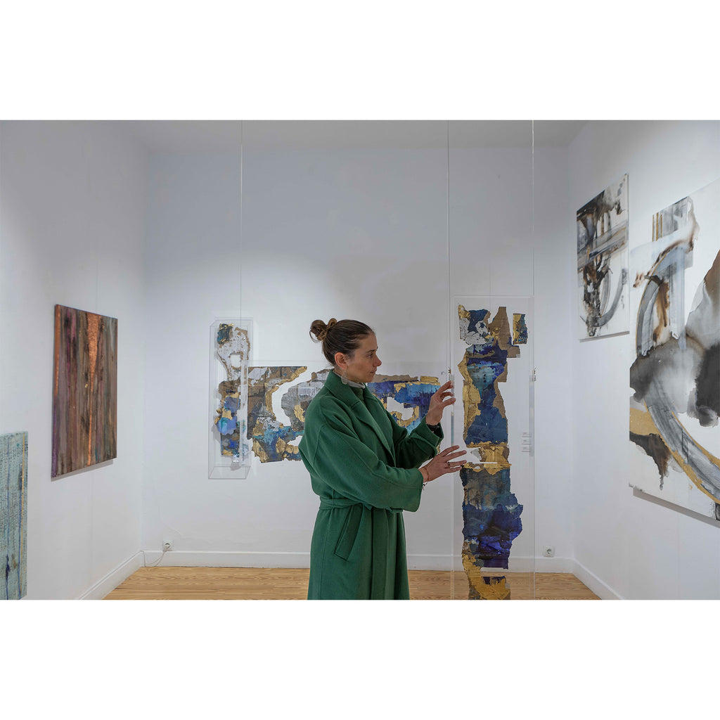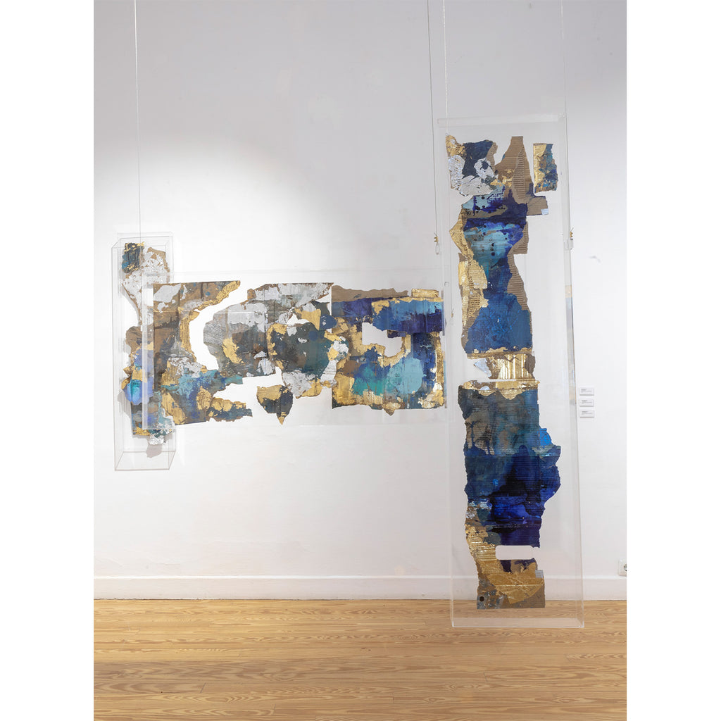 Through mixed media techniques, Kahn invites us to delve into a captivating play of textures and forms, where a diverse range of materials, such as pure pigment paint, cardboard, cement, walnut stain, imitation gold leaf, and Chinese ink, among others, converge to breathe life into spaces that evoke her Dominican roots, German, French, and Argentine heritage, as well as her Ibero-American present, in a continuous dance between lima and Madrid.