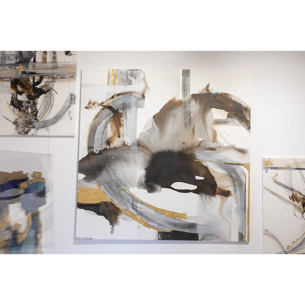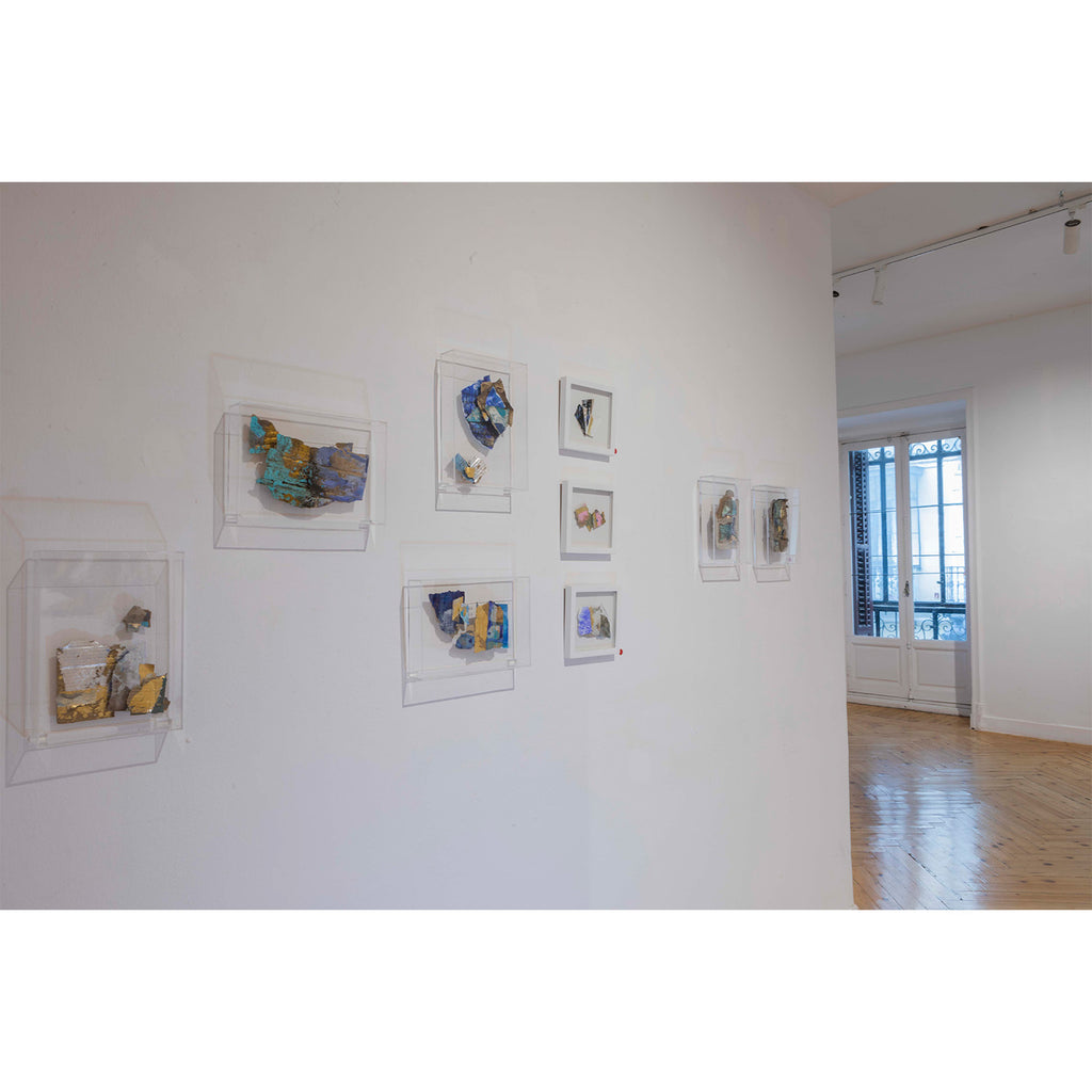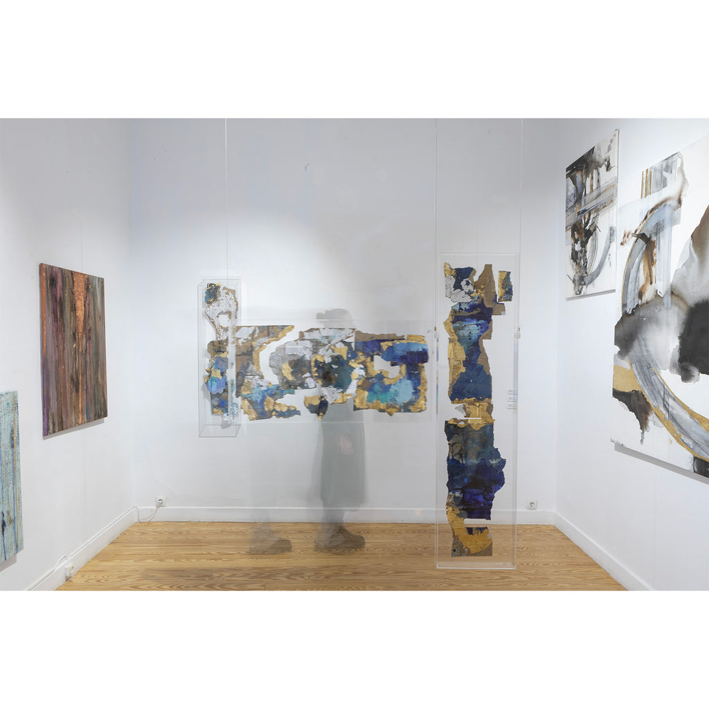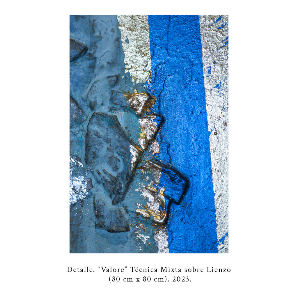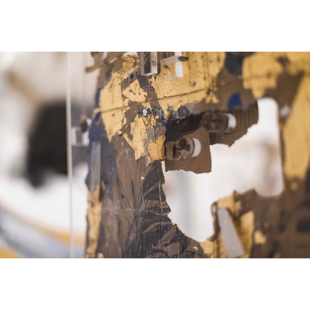 Through mixed media techniques, Kahn invites us to delve into a captivating play of textures and forms, where a diverse range of materials, such as pure pigment paint, cardboard, cement, walnut stain, imitation gold leaf, and Chinese ink, among others, converge to breathe life into spaces that evoke her Dominican roots, German, French, and Argentine heritage, as well as her Ibero-American present, in a continuous dance between lima and Madrid.